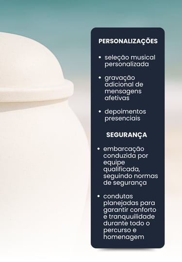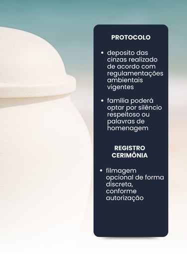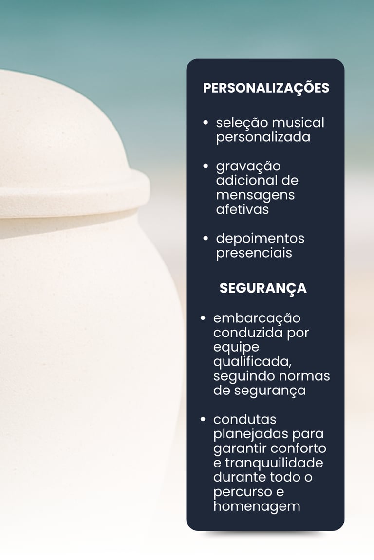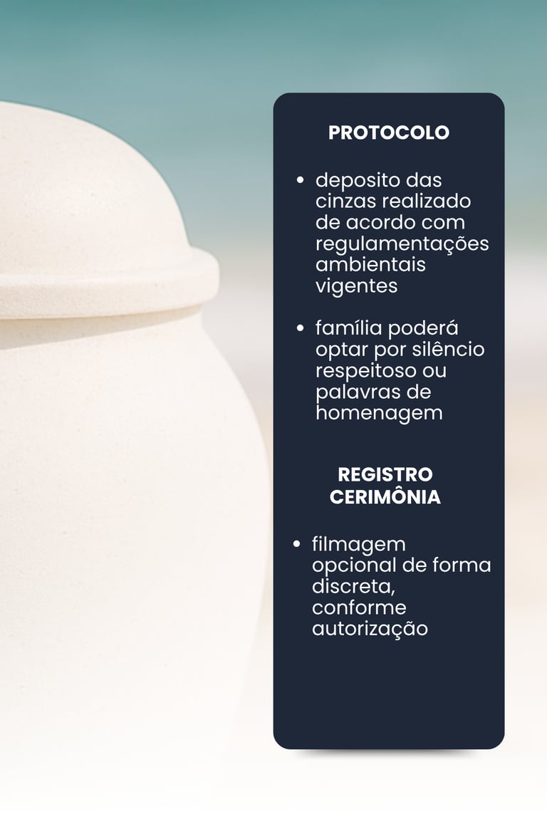Em seguida, é reproduzida uma mensagem especial previamente gravada e aprovada pela família, acompanhada de uma oração, enquanto as cinzas são depositadas no mar com pétalas de flores naturais.