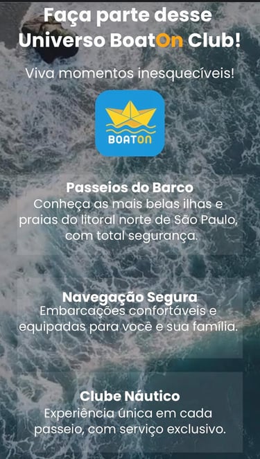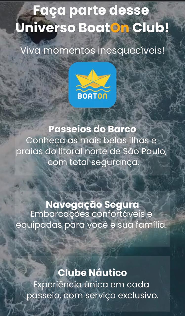 BoatOn é um clube de compartilhamento náutico localizado na praia da Barra do Una - litoral norte de São Paulo - São Sebastião, que oferece locação de barcos de alto padrão para passeios, com atendimento e serviços exclusivos desde 2019.